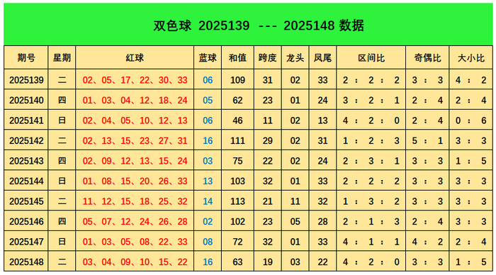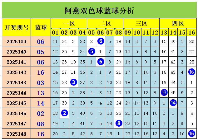 上期回想:双色球第2025148期开出奖号:红球03、04、09、10、15、22;蓝球16,其中红球三区比为4:2:0,奇偶比3:3,大小比为1:5,蓝球开出1路号码16。